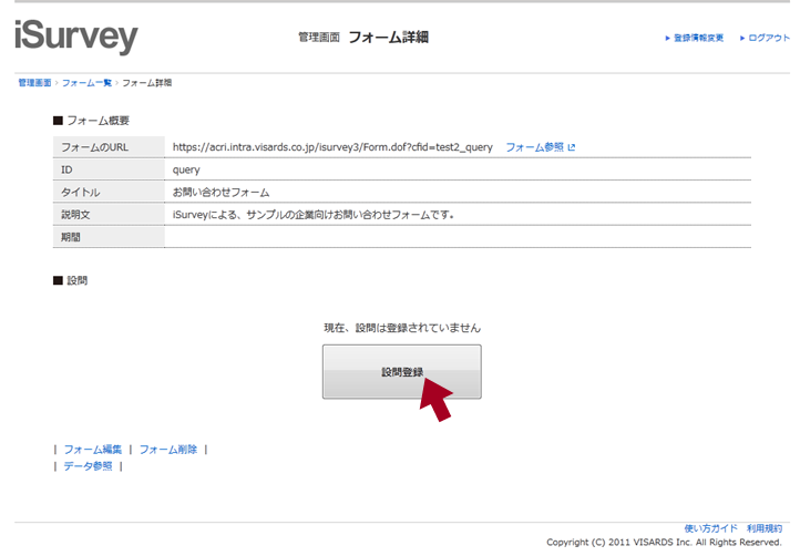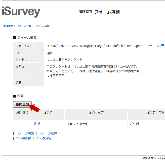 3) 表示されれた「フォーム詳細」のページで、「設問追加」ボタンをクリックします。