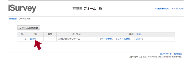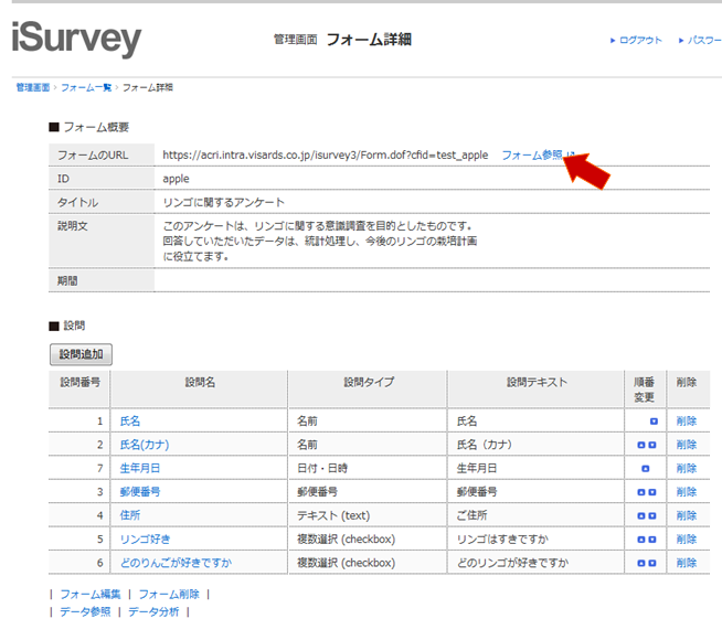 3) 表示された「フォーム詳細」のページで、「フォーム参照」のリンクをクリックします。