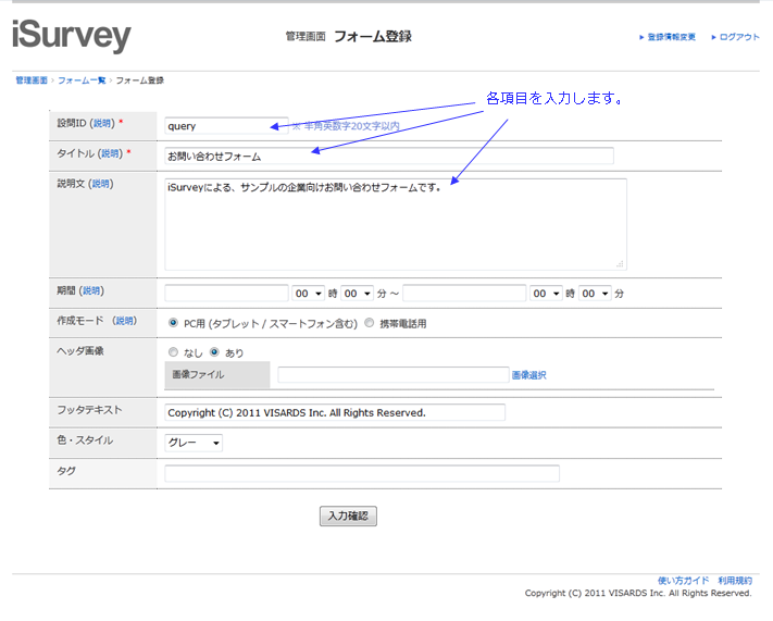 3) 表示された「フォームの登録画面」に、必要事項を入力します。