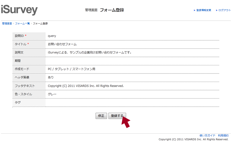 表示された確認画面で、入力に間違いがないどどうかを確認し、「登録する」ボタンをクリックします。