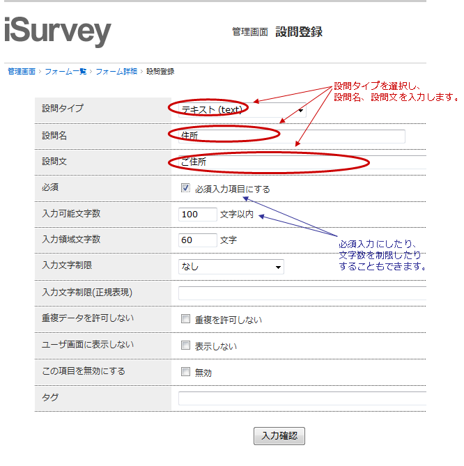 4) 表示された「設問登録」画面で、設問タイプ、設問名、設問文を入力します。