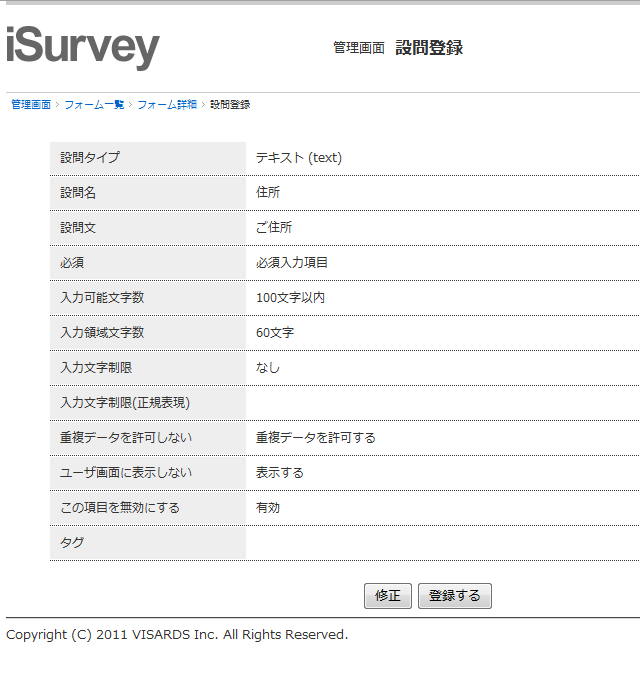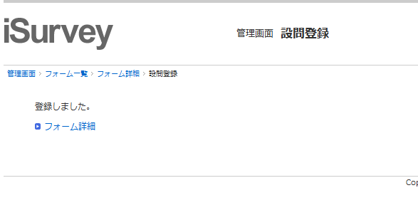 7) 次の質問項目を登録するには、「フォーム詳細」画面に戻って「設問追加」ボタンをクリックし、同じ手順で必要な設問を登録していきます。